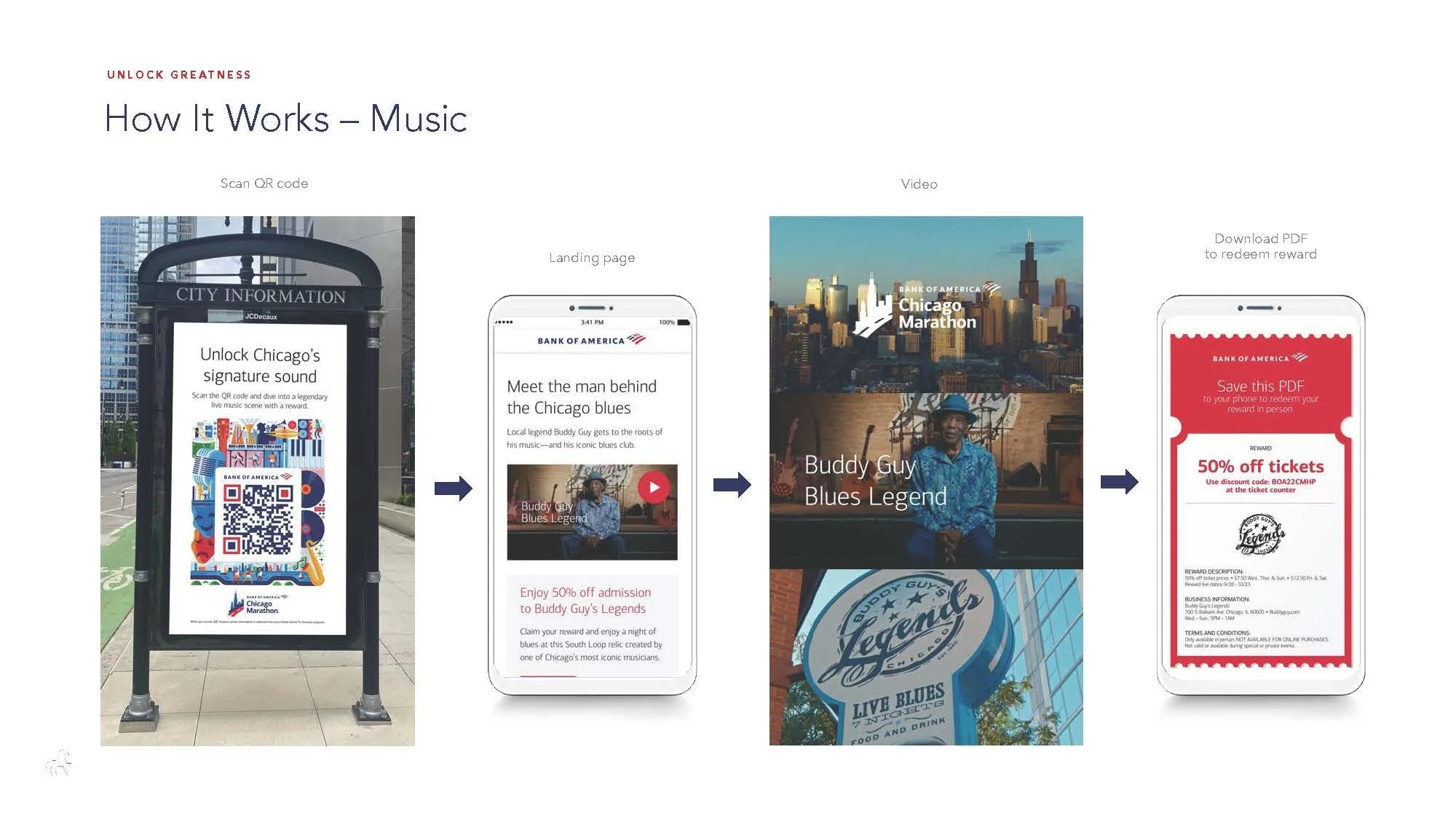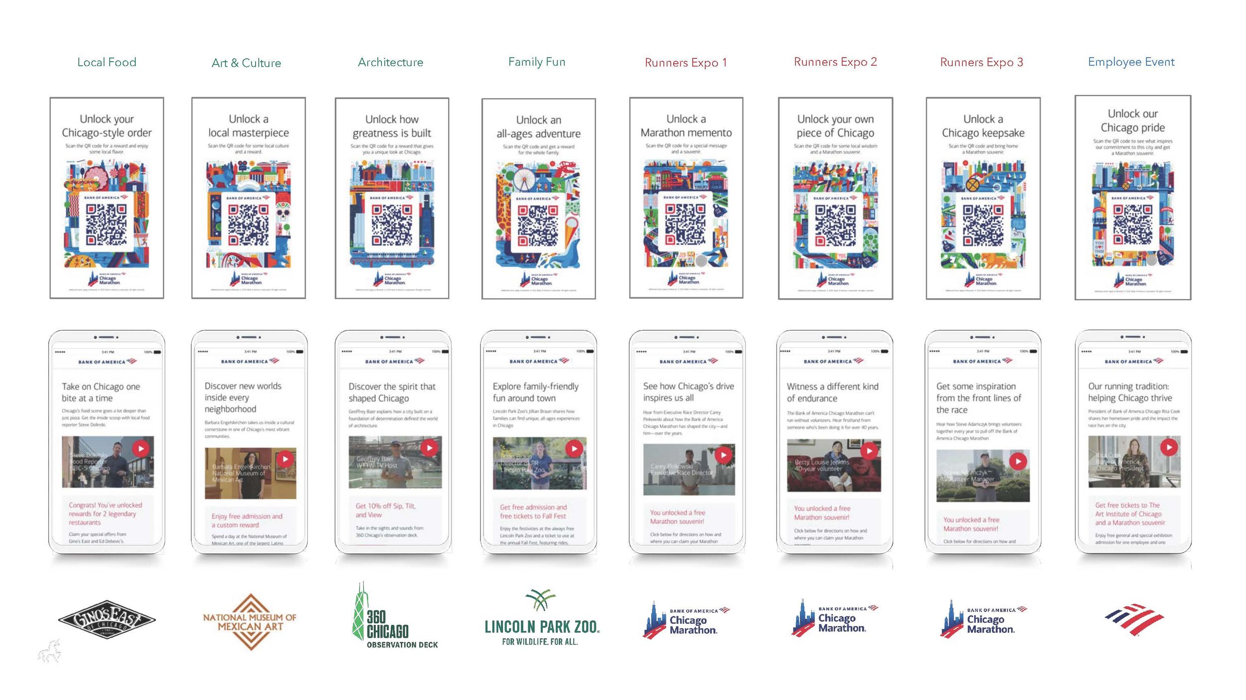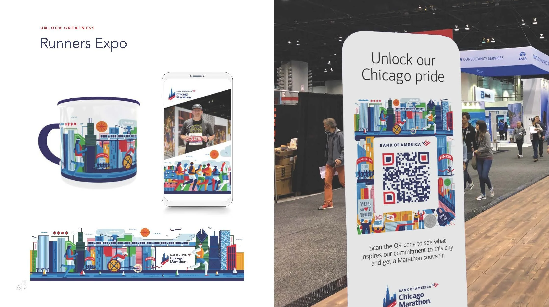 We helped Bank of America give Chicago marathon runners, spectators and locals the opportunity to unlock the greatness of the city. First we illustrated and placed nine unique QR codes all around Chicago. Once scanned, viewers were served videos featuring various marathon organizers, tourist destination representatives, and even local celebs like legend Buddy Guy. After watching the videos, viewers would receive a downloadable reward.